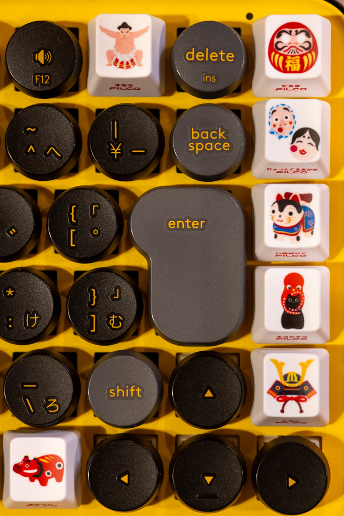 Fnキー、音声入力キーは押し間違えてイラッとすることがあるので、明確に違いがわかるキートップにしようと思い、探していたら「FILCO お土産キーキャップセット」というのがあったので、これにしました。キーの高さが元のものより明確に高いので、これで押し間違いが減るといいなと思います。