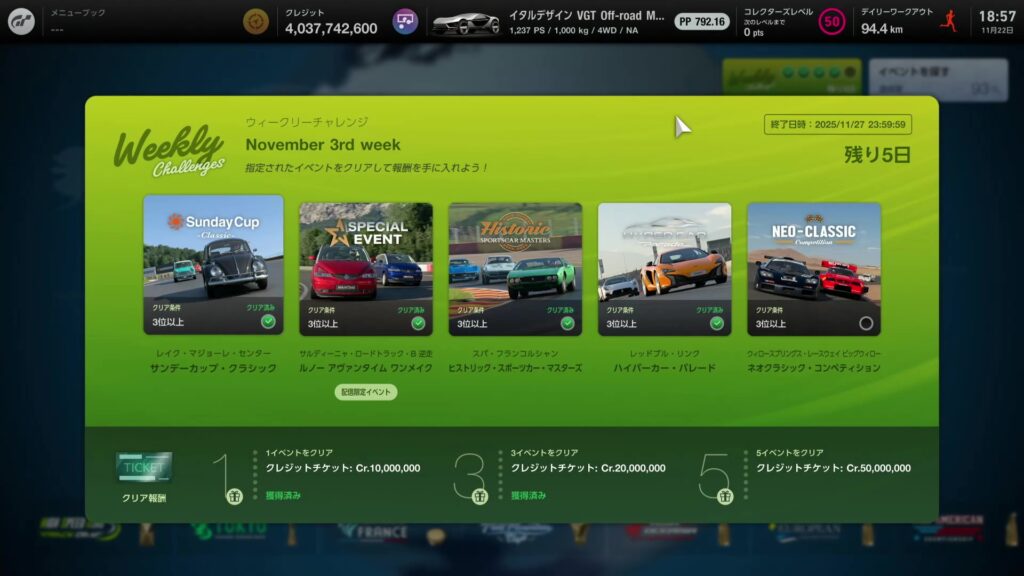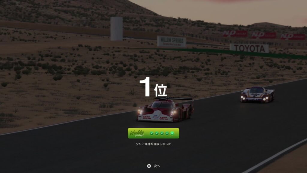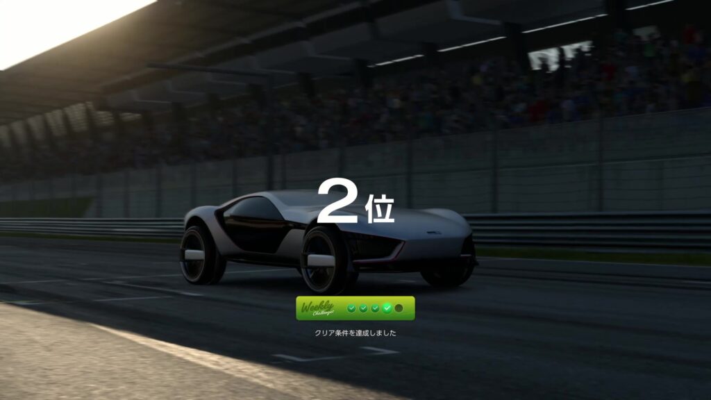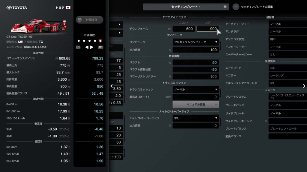 今週の最難関イベント。トヨタのGT-ONE Race Car (TS020) ’99を使用したのですが、最初制限PPに納めるために単純にバラストを積んだところ運転はしやすいもののあまり速くならず6位。